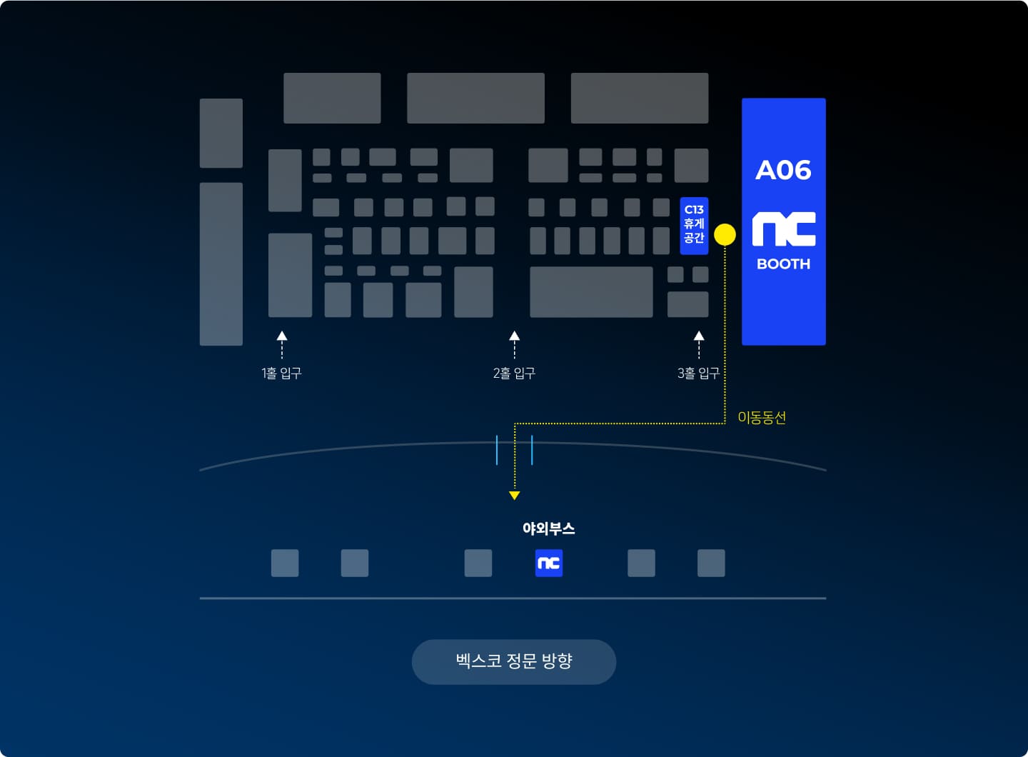 NC 부스는 제1 전시장 메인부스 A06, 휴게공간 C13,